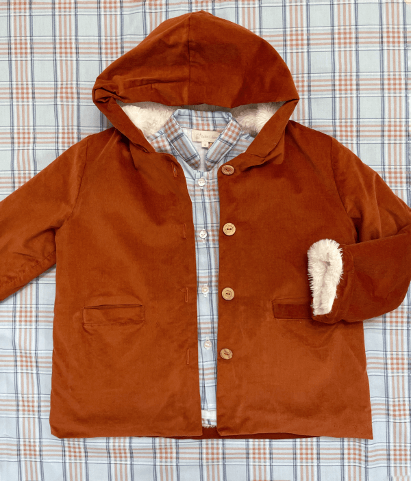 Forrado con pelito al completo, este abrigo de niño en color teja conjunta ideal tanto con la Colección Tartán como Colección Odette