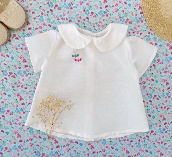 Bordado de libélulas en el pechito a juego con el culotte de nuestro tejido exclusivo Nenúfar.