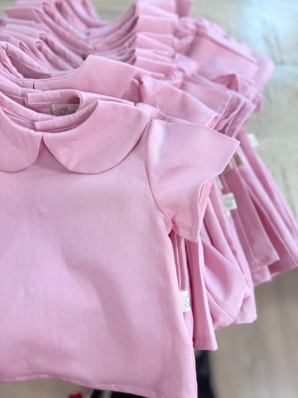 Camisa bebé Nube. Camisa para bebé de lino rosa, un tejido hecho de algodón orgánico, suave y respetuoso con la piel de los más pequeños. Con cuello bebé y botones en la espalda para facilitar el uso. Combínala con el Culotte de bebé Musas y tendrás un conjunto ideal.