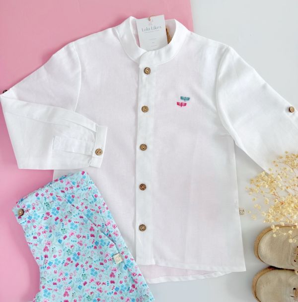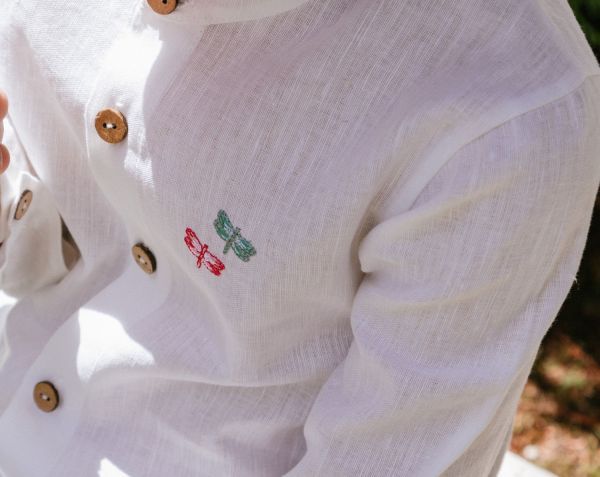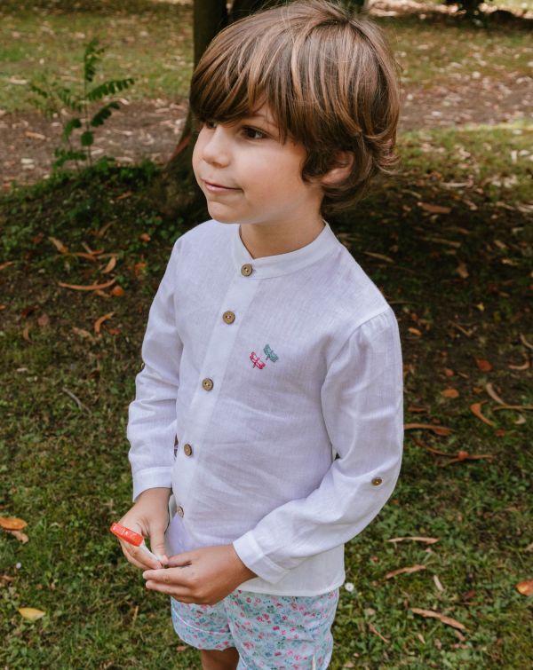 Camisa mezcla de lino y algodón en blanco para niño, con bordado de libélulas a juego con el estampado de la colección Nenúfar.