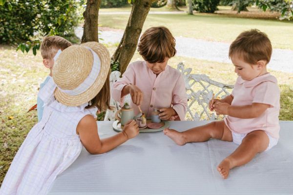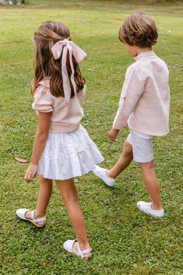 De cuello redondo y cerrada con botones en la parte delantera. Combínala con la Bermuda Niño Musas, de vichy de colores pastel.