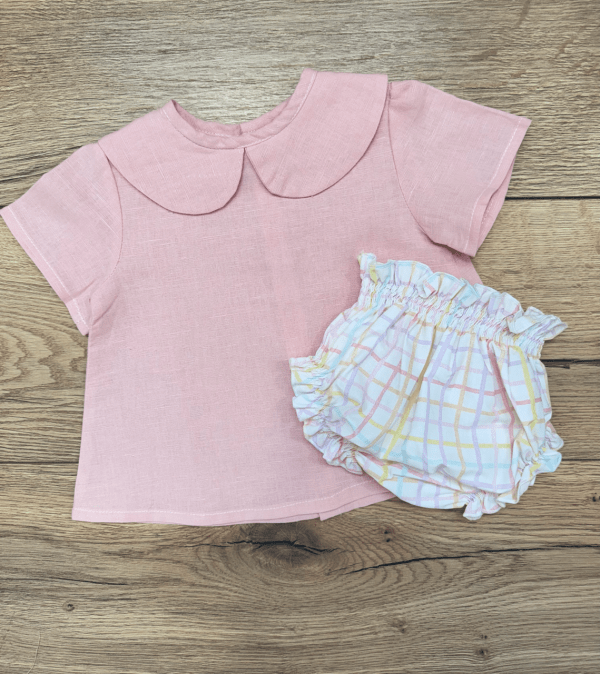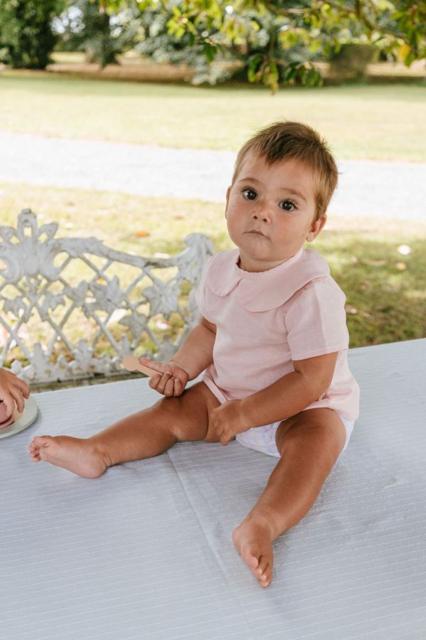El culotte en vichy para bebé tiene una suave goma en la cintura que hace que se adapte fácilmente. Combínalo con la blusa bebé Nube de lino rosa y tendrás el conjunto perfecto.