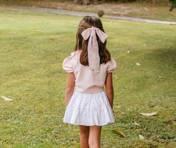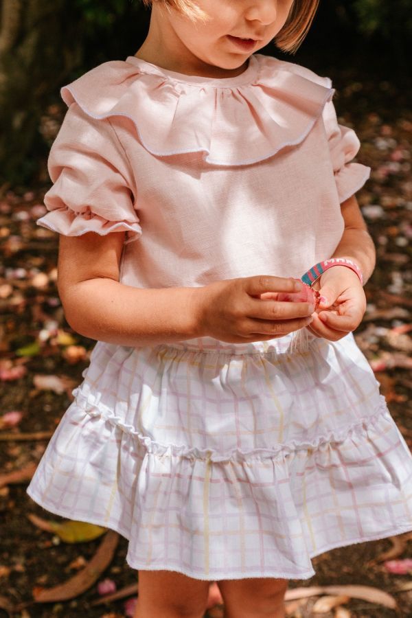 Falda NIña Musas. Falda en vichy de colores pastel para niñas de 2 a 10 años, confeccionada en el tejido exclusivo Musas, de algodón orgánico, diseñado por Lola Likes. Con braguita incorporada para mayor comodidad y suave goma a la cintura. Combínala con la Blusa de Niña Nube en lino rosa.